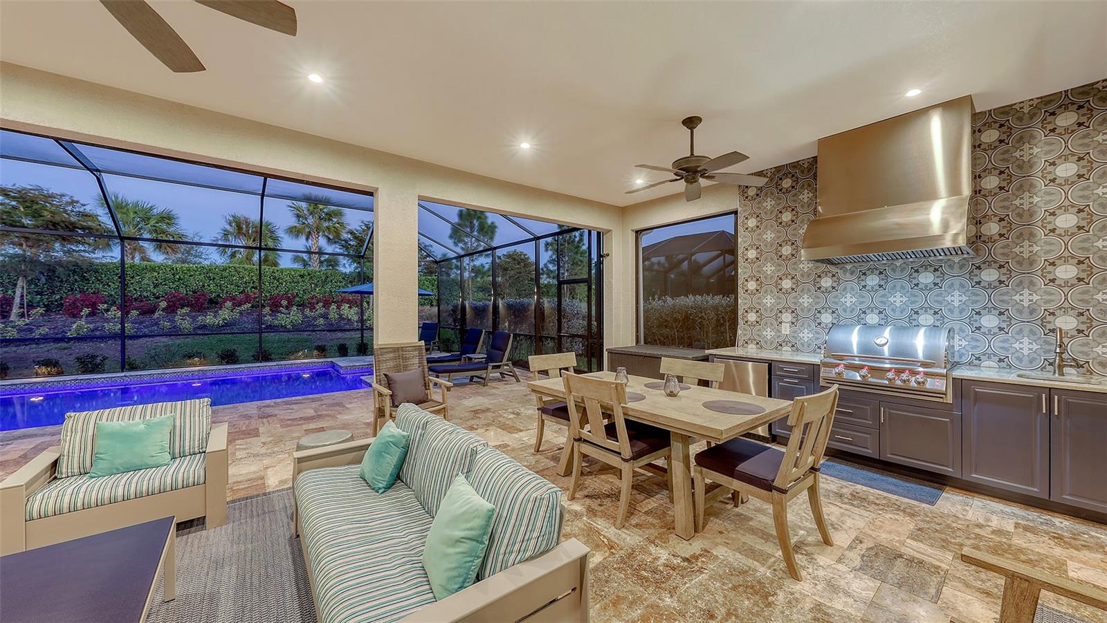 Incredibly custom and thoughtfully designed. With an abundance of seller-added bespoke upgrades, this home shows like a model. This 3-Bedroom+Den, 3-Bathroom, 3-Car Tandem Garage has the perfect amount of space, and even more to enjoy and entertain on your lanai. EXTERIOR UPGRADES include a Heated Salt-Water Pool & Spa with Built-In Cocktail Table w/Seating & Umbrella Slot, Multi-colored Pool Lighting, Gas Heater, Extended Covered Lanai, Storm Smart Hurricane Screens, Travertine Pavers, Cage Lights, and a Custom Outdoor Kitchen including Sink, Gas Grill, Range Hood, Mini Fridge, Granite Countertops, and Custom Tile Backsplash. Other exterior upgrades are Updated landscaping w/Lighting and Gutters. The KITCHEN FEATURES GE Cafe Stainless Steel Appliances (including mounted Over/Microwave Combo, Range Hood, and 5-Burner Gas Cooktop), Dry Bar with GE Cafe dual-zone 46 bottle Wine Fridge, Glass-encased upper cabinets and interior Cabinet Lighting, Under cabinet lighting, Cabinets in Island at Knee Wall, Oversized Island, Custom Pantry, Upgraded Lighting in Dining & Kitchen, Quartz Countertops, Custom Tile Backsplash, and Stainless Farmhouse Sink w/Delta champagne bronze faucets. The PRIMARY SUITE has a Board and Batten accent wall, the Bay Window Extension, Oversized Custom Walk-In Closet with built-in Hamper, and an Ensuite Bath with Dual Sinks, Quartz Countertops, Dual Shower heads plus Handheld Shower head, Toiletry Niche, Upgraded Vanity Lighting, Framed Mirrors, and Frameless Shower Glass. OTHER SPECIAL FEATURES are a Kohler Whole-House Generator, Whole House Surge Protector, 10 ft. Ceilings and 8 ft Doors throughout, Crown molding, Ceramic Wood-Look Porcelain Tile flooring throughout, Column-Accented Wall to define gathering and dining spaces, Custom Closets-by-Design throughout, Glass Front Door with Sidelights, Walk-in Closet in guest bedroom w/en suite bath, fully pocketing sliding doors and shiplap accent wall in Study/Den, Plantation Shutters on all interior windows, Upgraded Light Fixtures throughout, Ceiling Fans throughout, and Quartz Countertops and Kohler champagne bronze faucets throughout. The Laundry Room is complete with custom cabinetry, utility sink, custom tile work, and mounted hanging rack. The Garage is equipped with Insulated garage door and a tandem 3rd garage bay with built in storage. Tray Ceiling w/molding and Kichler lighting in foyer. Ample storage. Located in the illustrious Esplanade at Azario of Lakewood Ranch, this property offers the ultimate in privacy and exclusivity, yet you don’t need to leave the gates in order to enjoy a culinary dining experience, casual poolside drinks, or any of the numerous social and active amenities Azario has to offer. COMMUNITY FEATURES: 18-Hole Championship Golf Course (not deeded to property, but memberships are available through the Pro Shop), Pro Shop & Bunker Bar, Aqua Driving Range, Full-Time Activities Director, Resort-Style Pool & Poolside Bahama Bar, Spa/Wellness Center, Culinary Center w/ Teaching Kitchen, Barrel House Bistro, Olive & Vine Pizza Kitchen, State-of-the-Art Fitness Center, Sports Courts, Clubhouse, 16 Pickleball Courts, 6 Har-Tru Tennis, Bocce Ball, Flex Space for Gaming, Meetings & Activity Center, Walking Trails, Dog Park, Community Garden & Fire Pit.